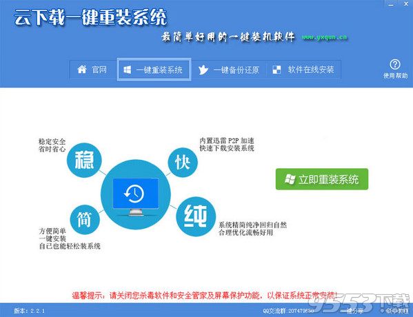 云下载一键重装系统是一款功能强大、专业免费的一键重装系统软件,此款软件能够帮助用户一键安装winxp、win7、win8等操作系统。软件方便简单,用户无需专业知识,只需根据安装提示进行安装即可,需要的话可以来下载使用。