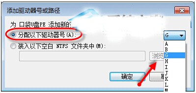 ![]() win7显示不出U盘盘符解决方法图4 五、我们可以选择一个驱动器号给它,这个驱动器号就是我们接下来要给它分配的U盘盘符,在这里我们选择的G,选择完成后点击确定即可。