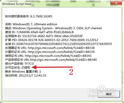 ![]() 最简单win7系统一键激活方法图7 从下图可以看出操作系统的部分产品密钥和许可证状态,最后点击“确定”按钮。
