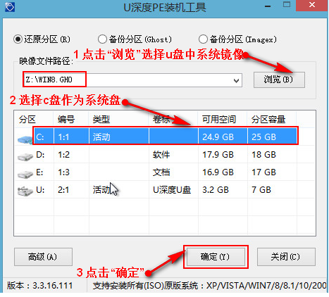 没有光驱电脑图解2 进入pe后会自启u深度pe装机工具,首先点击”浏览”将保存在u盘的系统镜像添加进来,接着选择c盘作系统盘存放镜像,点击“确定”