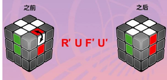 魔方电脑图解6 第三步,然后让中层边块归位。把白色面转向下,找出红绿边块,若红绿边块在顶层则按顺时针方向转动顶层,直到边块与图上的1个情况相同,在按照口诀转动魔方,使边块归位。若红绿边块在中间某层,但位置错误或颜色错误,则先使红绿边块在右前方的位置,再重新按照下面其中一个次序旋转1次。
