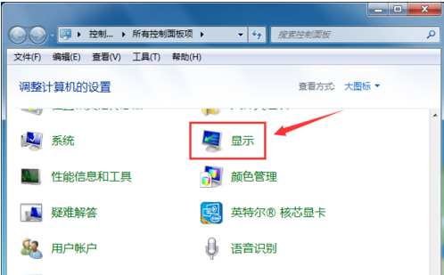 3.在打开的控制面板中将查看类型改成小图标,然后找到显示选项打开,进入下一步。