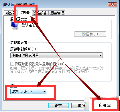 3、在高级页面下,找到监视器,将颜色改为增强色(16位),然后点击应用确定