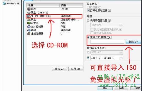 上图:选择CD-ROM后再选择右边的“使用ISO镜像”可以直接导入ISO文件,免除了安装虚拟光驱的烦恼呢。这里我们选择一个ISO文件为本次教程进行安装示例。如下图: (电脑入门到精通网 )