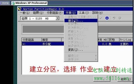 能看到一个“未分配”类型的硬盘,其大小为8189MB,也就是前面设置的8G左右。现在按照下面的步骤对虚拟机硬盘建立分区,下图: