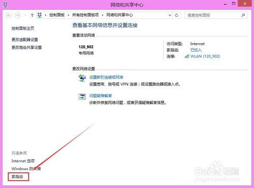 在打开的网络和共享中心的左下角可以看到家庭组,点击家庭组,如下图所示。