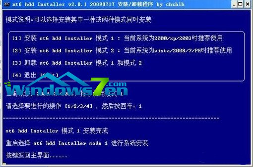 4、运行NT6 HDD Installer,会出现下面的窗口,如果您现在的系统是XP可以选择1,如果是vista或者win7选择2,选择后按回车开始安装,1秒钟左右结束,之后就是重启系统了。 5、在启动过程中会出现如下界面,这时选择新出来的nt6 hdd Installer mode 1选项。