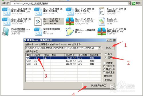 选择“还原”选项和 需要重新安装系统的还原分区。 再点“恢复选择的分区”即可。