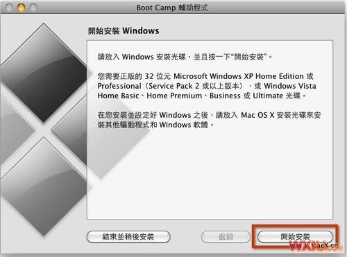 之后,当程序分割完硬盘后,您会在您的桌面看见一个叫做BOOTCAMP的分区,接下来只要将您准备好的Windows 7安装光盘放入,再按下开始安装即可。